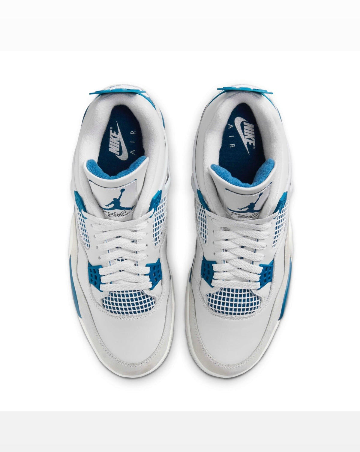 The 2024 edition of the Air Jordan 4 Retro ‘Military Blue’ also known as 'Industrial Blue' brings back a coveted OG colorway of the legacy silhouette. Smooth off-white leather is utilized on the upper, featuring quarter panel netting and a tonal nubuck forefoot overlay. A vibrant blue Jumpman logo adorns the woven tongue tag, matching the molded eyelets and a back tab marked with Nike Air branding. The sneaker rides on a lightweight polyurethane midsole with encapsulated Air-sole cushioning in the forefoot and a visible Air bag in the heel.