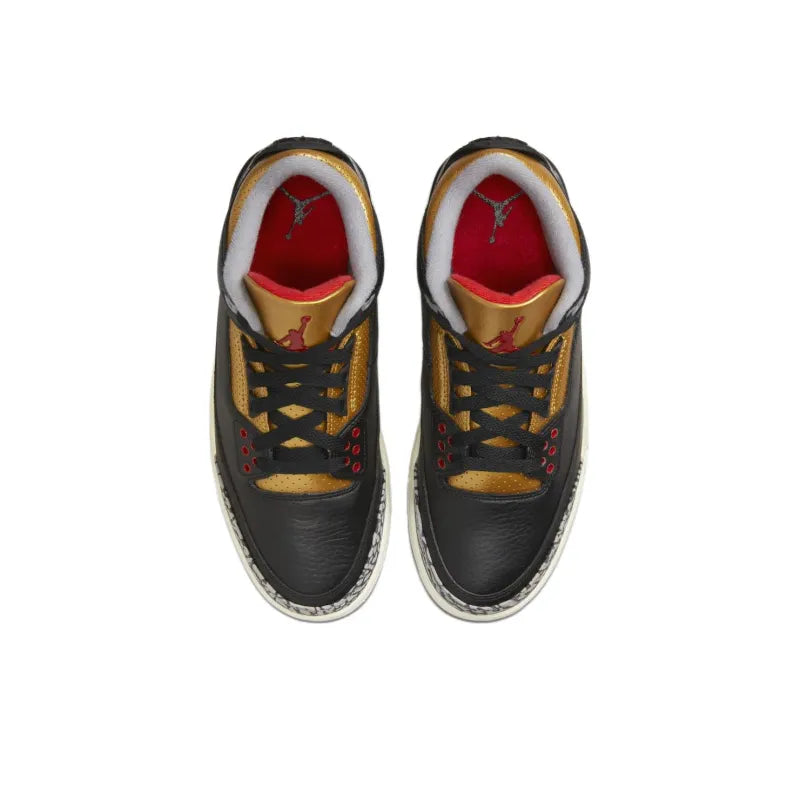 The Air Jordan 3 Retro "Black Cement Gold" combines the classic Black Cement colorway with striking gold accents. The upper features a premium black leather construction, highlighted by the iconic elephant print on the toe and heel. Gold detailing adorns the Jumpman logo on the tongue and the eyelets, adding a luxurious touch. The midsole showcases the classic visible Air unit, ensuring both comfort and style, while the rubber outsole provides excellent traction. This edition pays homage to the original design while incorporating a bold twist, making it a must-have for sneaker enthusiasts and fans of the Jordan brand.