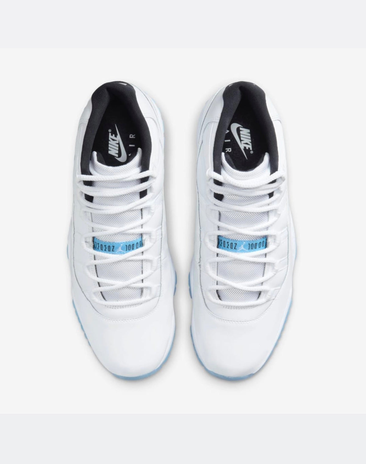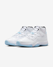 The 2024 edition of the Air Jordan 11 Retro 'Columbia/Legend Blue' brings back an OG colorway of the championship model. Laces feed through webbing eyelets to secure the white leather upper, bolstered with a tonal patent leather mudguard and marked with a blue embroidered Jumpman on the lateral collar. Contrasting black accents land on the interior lining and back tab, featuring signature '23' branding. A white Phylon midsole packs a full-length Air-sole unit for lightweight cushioning. Underfoot, a blue-tinged translucent rubber outsole reveals a carbon fiber shank plate for midfoot stability.