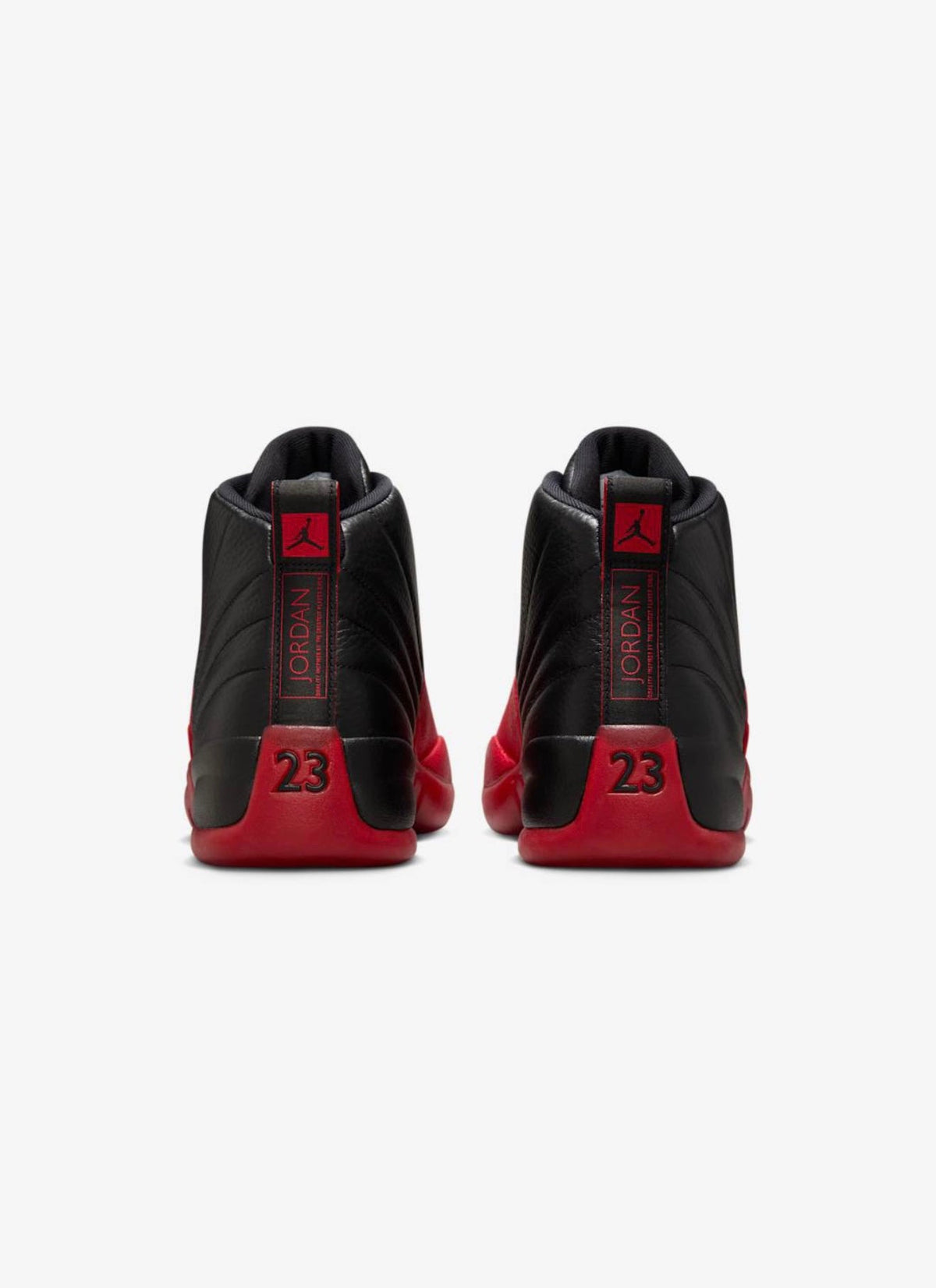 The 2025 edition of the Air Jordan 12 Retro 'Flu Game' brings back the shoe that Michael Jordan famously wore during Game 5 of the 1997 NBA Finals. Radiating stitch lines decorate the black tumbled leather upper, contrasted by lizard-textured overlays in Varsity Red. Jumpman branding appears on the tongue and heel tab. Performance benefits include a lightweight Phylon midsole with full-length Zoom Air cushioning. Underfoot, the semi-translucent red rubber outsole features black herringbone traction pods and an exposed carbon fiber shank plate.